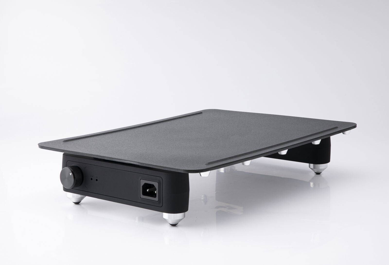 ホットプレートが発明されてからおよそ半世紀なんですが、 これまでほとんど変化らしい変化はありませんでした。そういう意味で、常識を変えた新しいホットプレート。全体的に黒色で、それぞれの角に脚がついている。黒い板が宙に浮いている感じ。