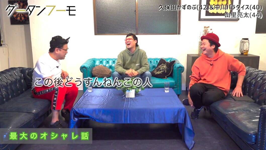 ハッキリいって登場時の挨拶と、途中で展開される白熱した芸人論、エンディング以外はテレビや無料の動画配信では流せないレベルだ。自分がディレクターの立場なら「使えるところがないじゃないか!」と焦るような(良い意味で)下世話な話が次々と展開される。本家『グータンヌーボ』はキラキラ女子が似合うオシャレな場所で行われるが、ドロドロ男子しか映っていない『グータンフーモ』の雰囲気は雑居ビルの建物の裏側の排気口から出てくる焼肉の匂いが漂うような薄暗い場所でワチャワチャとじゃれあいながら話している様子だ。