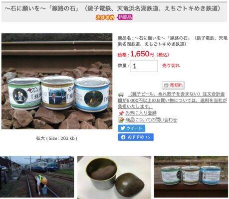 社長同士が仲がいいという新潟のローカル線、えちごトキメキ鉄道の社長の発案で、銚子電鉄、えちごときめき鉄道、さらに静岡の天竜浜名湖鉄道と3社共同で「線路の石」の缶詰を発売。これが話題となり完売する状態ということでした。