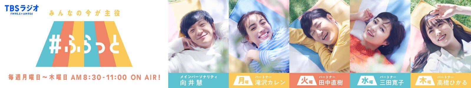 メインパーソナリティにパンサー向井慧さん。そして月曜パートナーに滝沢カレンさん、火曜はココリコの田中直樹さん、水曜は三田寛子さん、木曜は髙橋ひかるさんが登場。向井さんが隔週出演となる木曜はTBSアナウンサー喜入友浩がアシストするというチーム体制です。