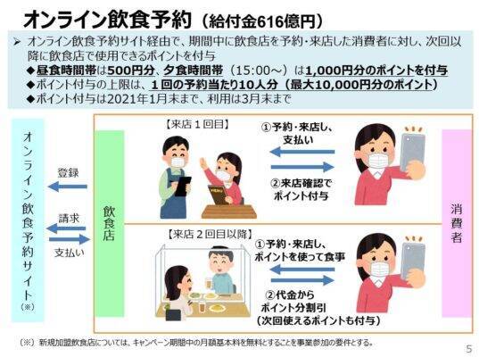 消費者からみれば、「食べログ」や「ぐるなび」等の予約サイトを経由して食事をした場合、昼は500円分、夜は1000円分のポイントが付与される仕組みで、お得感があります。