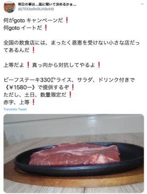 お父さんがやっているお店のツイッターには、「何がGOTOキャンペーンだ!何がGOTOイートだ!上等だよ、ビーフステーキ330グラムで、ライス・サラダ・ドリンク付きで、土日限定、1580円で提供するぞ!」と、GOTOではなく、あくまで安く美味しくを貫く決意が書き込まれていました。