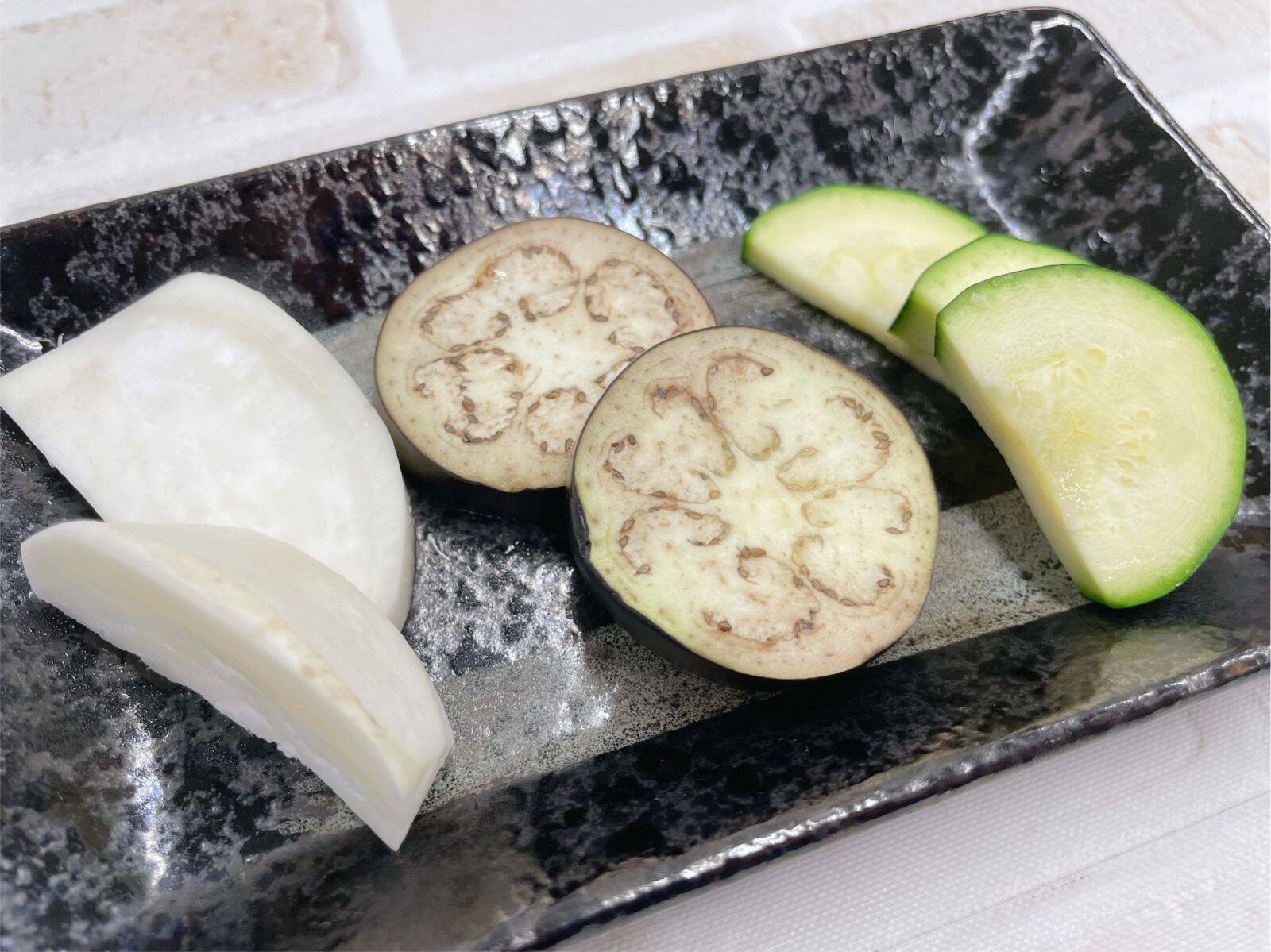 「ズッキーニ」「ナス」は輪切り、「カブ」はクシ切りにしました。