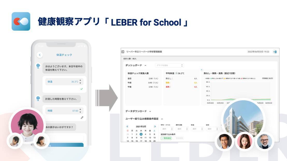 保護者のスマートフォンから、お子さんの体温、体調とか、あとは今日学校に出席するか、そういったものをスマホで入力していただきまして、学校の先生方の管理画面の方にですね、子供たちの出席状況とか、体調の一覧が表示されるといった仕組みになっております。