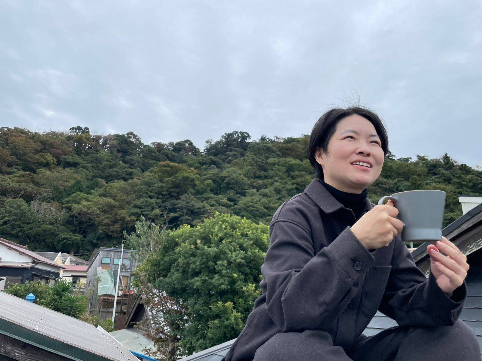 イモト:ちょっと待って!この屋根裏のカフェスペースからさらに戸を開けると・・・テラスがあります!3畳くらいのスペースかな、ここも最高!そして、このテラスからさらに古民家の屋根の上に階段が繋がっていて、ここも行けちゃうってこと!?行っちゃおうか!?アスレチック状態だね。かなり手作りの階段を登ると、ここは柵も何もない2畳くらいのスペースになっていて。どれくらいだろう・・・“マッターホルンの頂上”くらい!?(笑)人が2人くらい座れるスペースで。立ち上がると目の前の海がブワーッて見える!!先週、森戸海岸で見たパノラマの景色がここでも楽しめますね~。いいですね~。今日は曇っているんですけど、これが晴れていて、夕方ここで座ってビールなんて飲んじゃったりしてさー、私はそんな飲めないけど。すべての幸せが詰まってるかも!