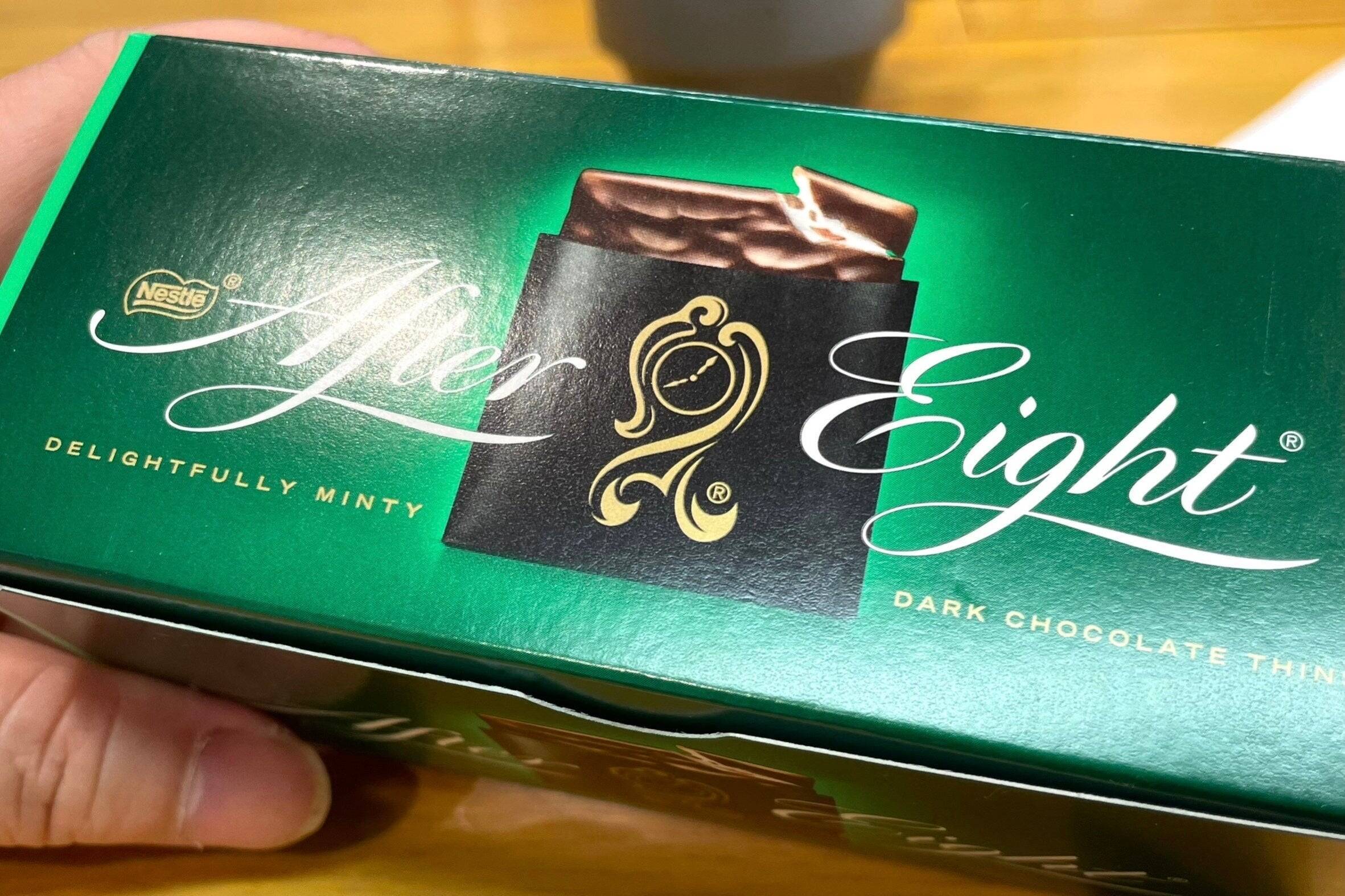アフターエイトは、1962年に「イギリス」で誕生して以来、世界60か国以上で愛され続けているミントチョコレート。高級感あふれるブラックのボックスに、時計の針が「8時5分頃」を示したロゴマークが目印で、1枚ずつ個別包装された、正方形の薄いチョコレートが入っています。