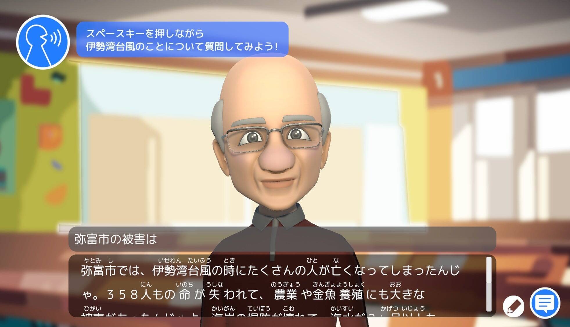 この伊勢湾台風のAI対話システムは、画面で話すのは作り物のキャラクター。これは、伊勢湾台風の被害地域は非常に広いため、特定の一人にしてしまうと他の地域で使えなくなってしまうので、あえて、キャラクターにしてどこでも使えるようにしました。