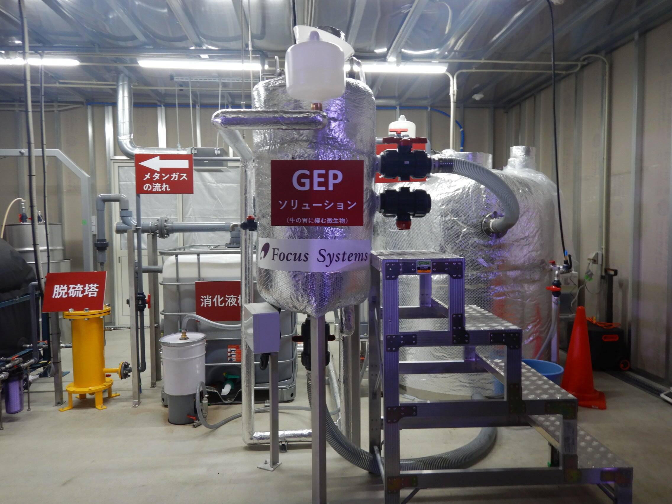 (雑草発電の装置『エコスタンドアロン』真ん中のGEPという所で、雑草をメタンガスに発酵させています!)