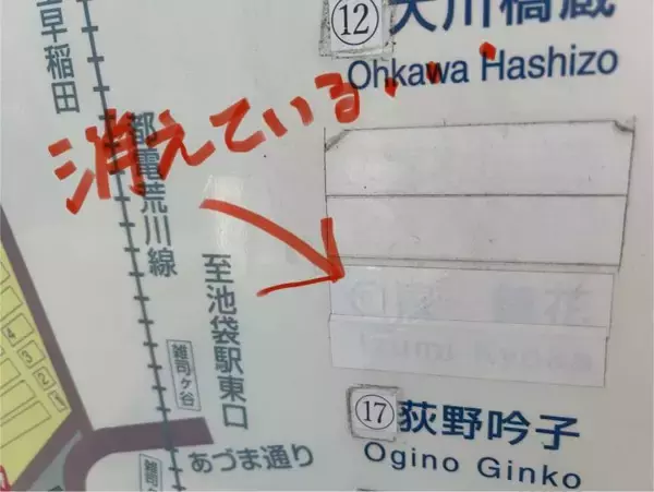 敷地内に様々なお墓がある中で、少し前に「泉鏡花」の墓石が消えたことが話題になっていたのですが、たしかに、霊園にある掲示板でも、「泉鏡花」という案内表示の上からシールが貼られていました。