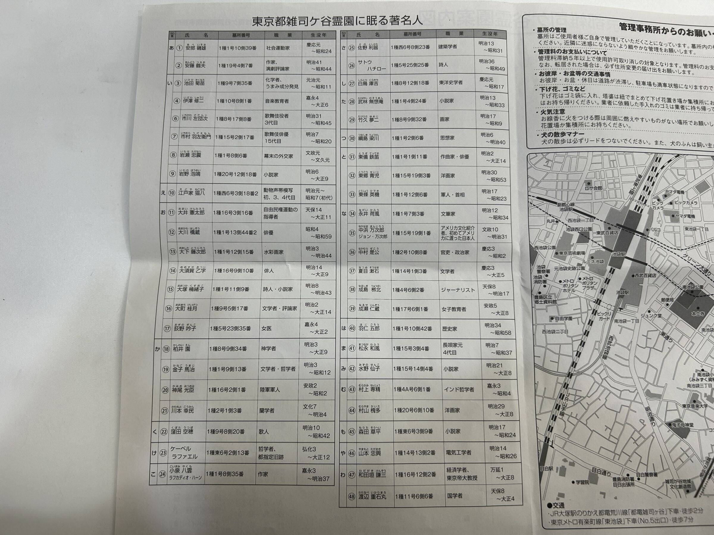 <MAP裏面には、雑司ヶ谷霊園に眠る著名人の一覧表があります>