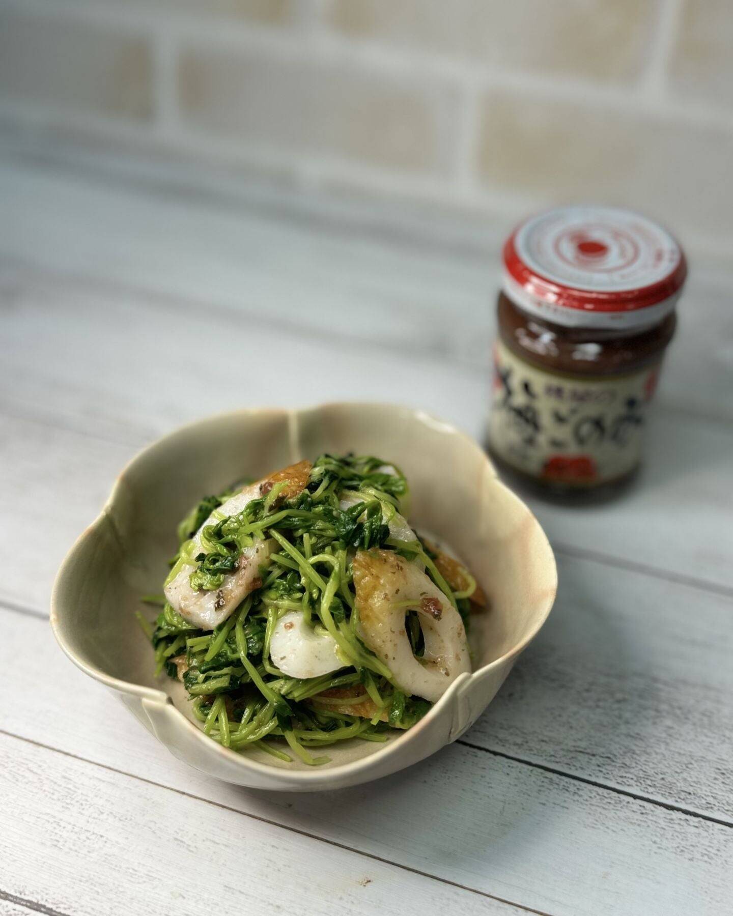 ②切ったちくわ、豆苗、そして、混ぜ合わせた調味料(和え衣ごろも)を和えて完成です!
