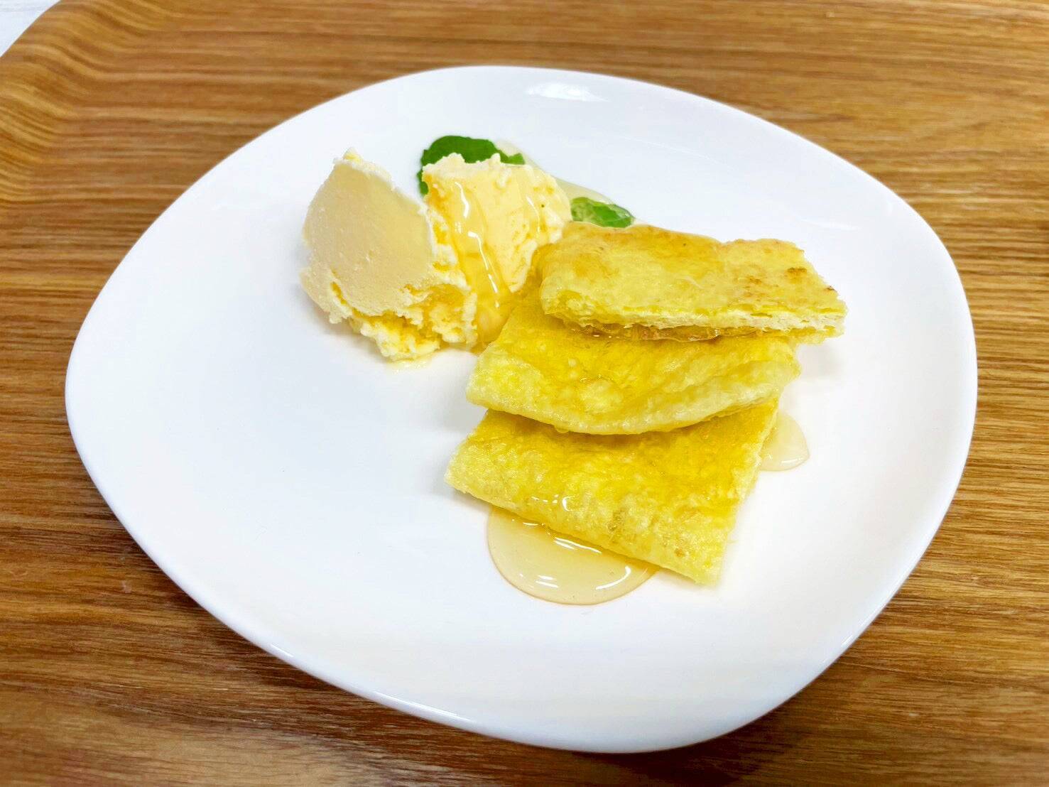 油揚げを冷まして、バニラアイス、ミントを添えて、たっぷりとハチミツをかけたら完成!