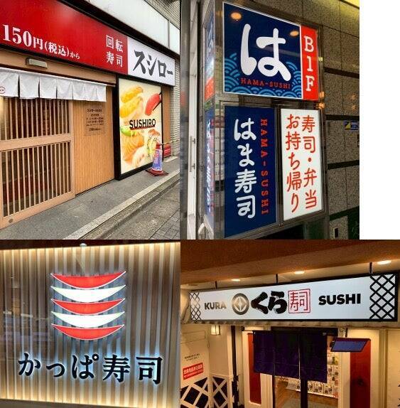 4つの大手回転寿司チェーン = スシロー、くら寿司、かっぱ寿司、はま寿司を