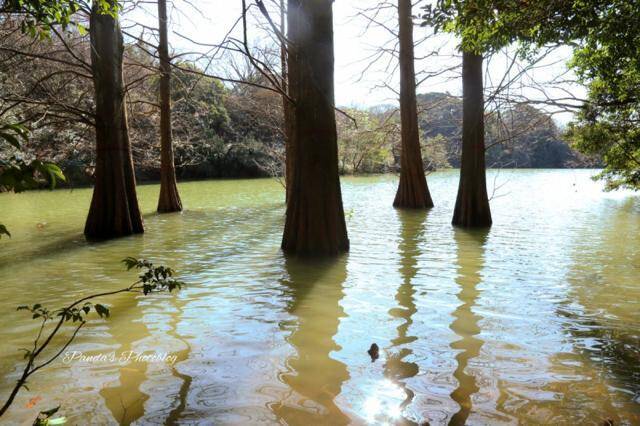 落羽松と書きますが、杉の一種。九州大学が研究のために植えたものがこれだけ大きくなったそうです。本当に立派な木々。確かにこういう木を見られるのは、なかなか日本では無いかも・・・。落羽松は湿地で育ち、水に浸かっている状態からでも育ちますが、陸でも大丈夫とのこと。ただこういう沼地での環境が少ないんでしょうね。