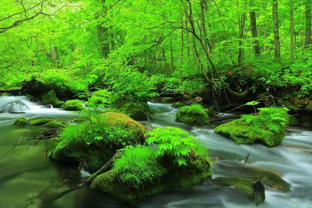 緑に染まる奥入瀬渓流は、梅雨時に水量を増して、豊かな流れを見せます。奥入瀬グリーンは、雨で洗われてより一層緑を濃くします。心も身体も緑に染まる森林浴ができますよ。