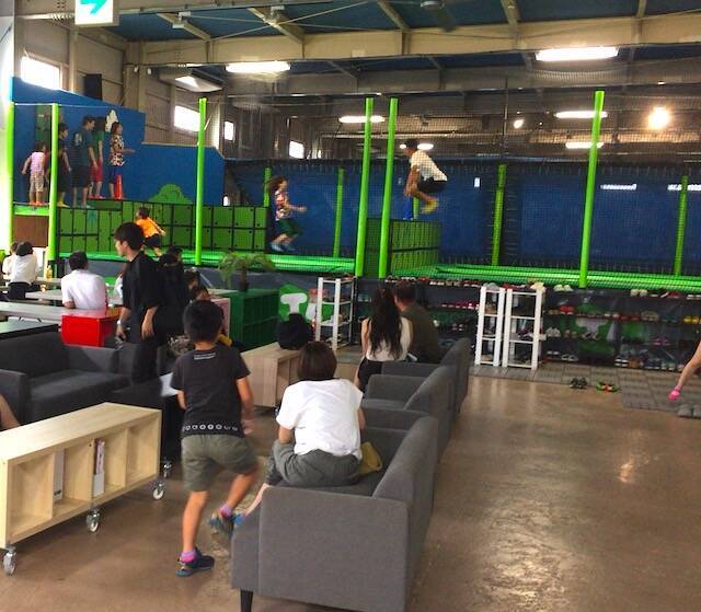 中に入ると広々とした休憩所があります。雑誌なども置いてありました。ここで入場時間まで待つことに。トランポリン中に疲れたときもここで休憩することができます。