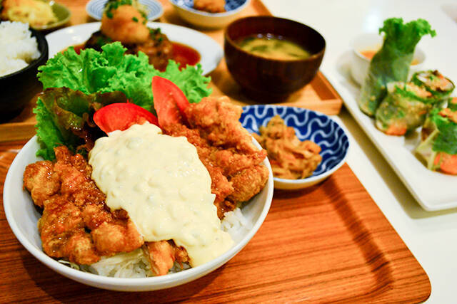カリッとあげられた鶏唐揚げに、甘酸っぱい南蛮ダレが絡み、ジューシーな味わいです。これにタルタルソースを思う存分つけて食べてくださいね。