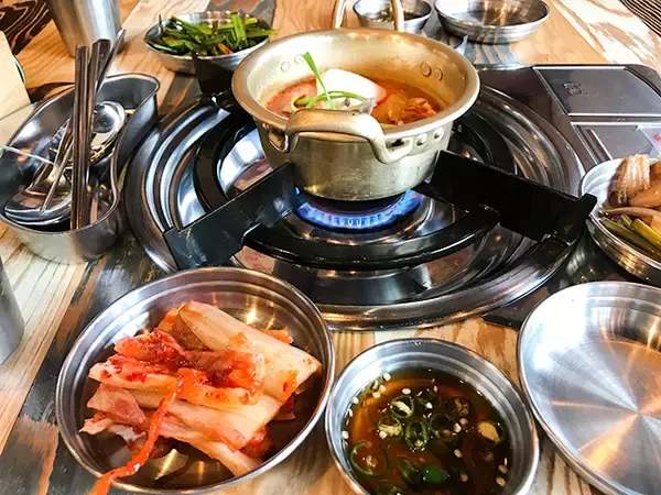 まずは、小さなおかずと味噌チゲがセットされます。味噌チゲがいい感じに出来上がり、熱々を食べているところで、主役のホルモンの登場です。