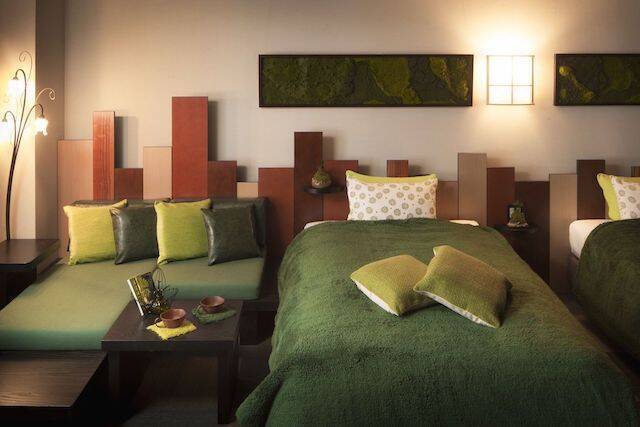「苔インテリア」。その名にふさわしい1室限定の客室には、苔玉や苔の群落を表現した壁飾りはもちろん、ベッドやマット、クッション、ティッシュケースにいたるまで苔を表現したグッズで満たされています。スリッパには胞子体が付いているんですよ。