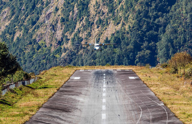 テンジン・ヒラリー空港はネパールにあります。エベレストへの玄関口として使われているこの空港は、崖の上にある小さな空港なんです。標高2,843m。標高が高いと、着陸のスピードをコントロールするのが困難だそう。