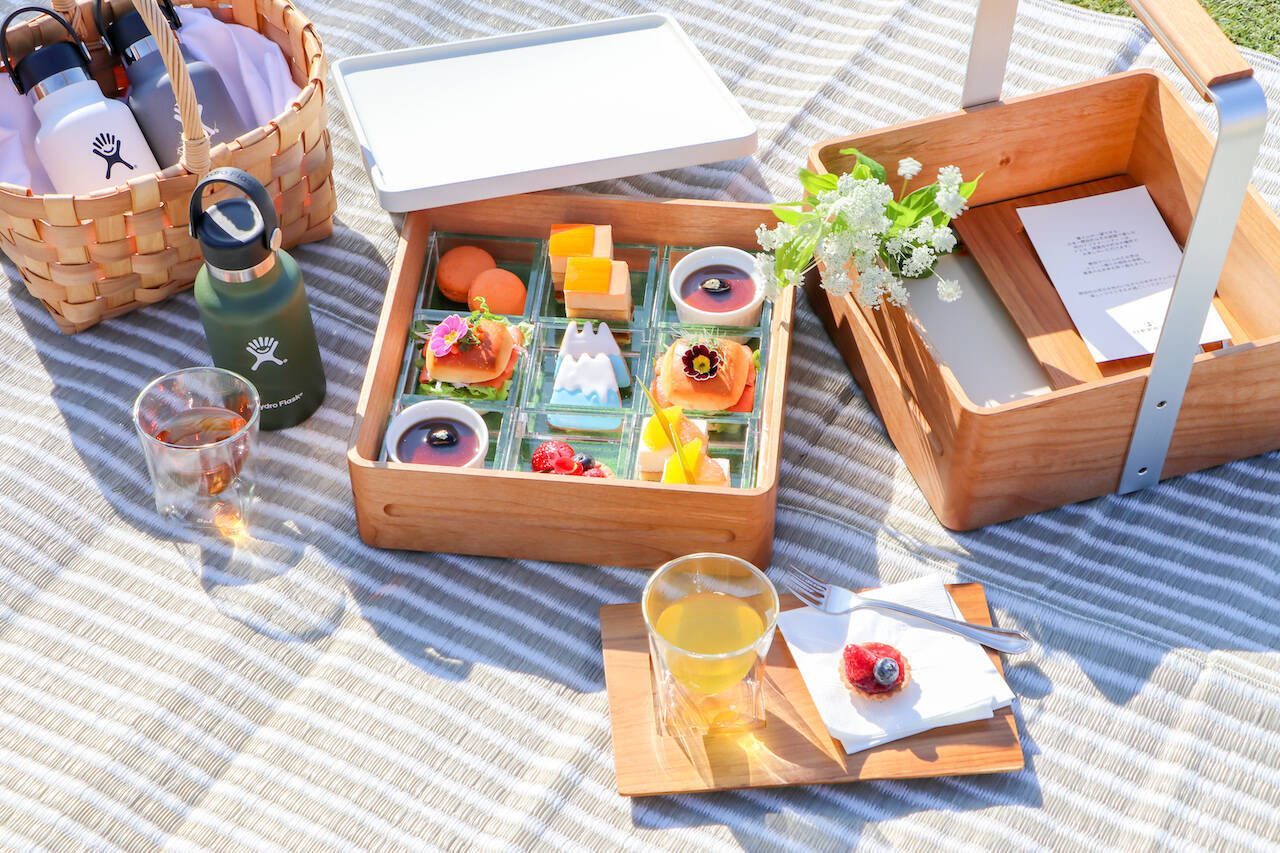 日本のピクニックをイメージして、飲料ボトルや岡持ち型の容器にスイーツやサンドイッチが詰まっているのが特徴。フォトジェニックなティーセットに食べる前からワクワクしちゃいます!