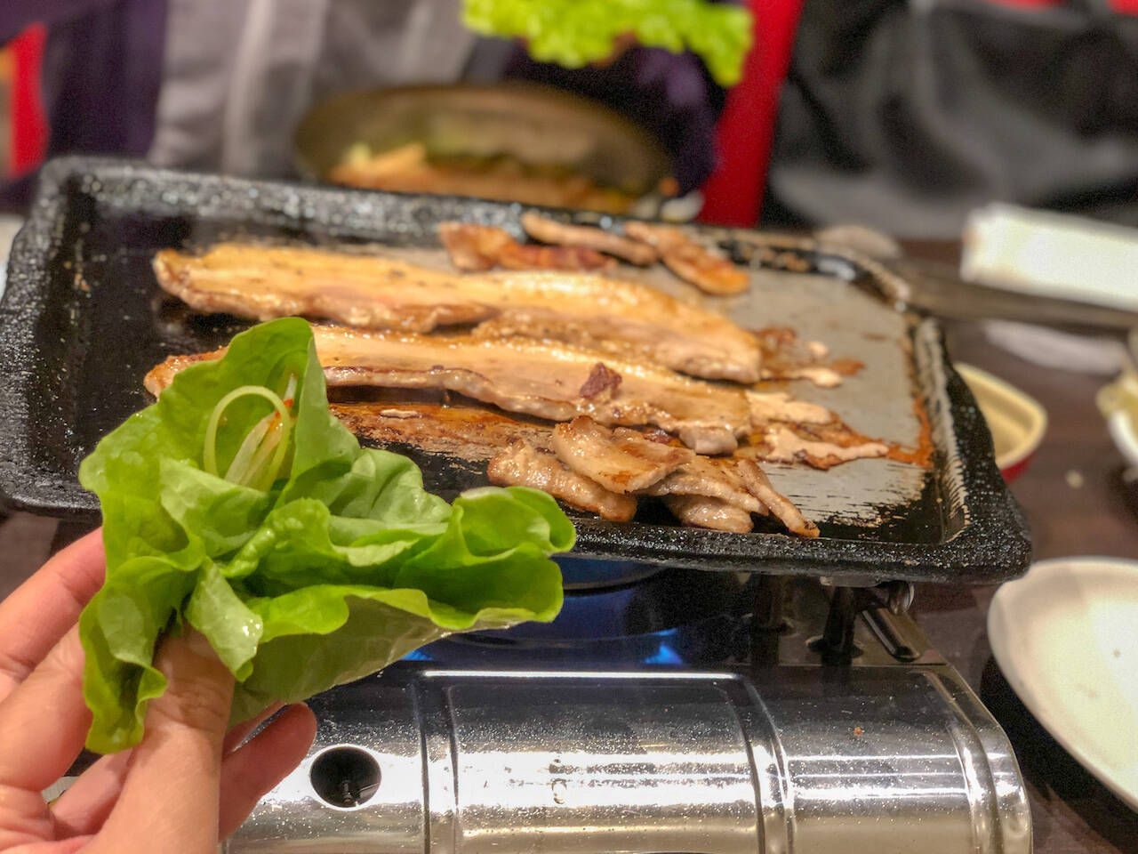 サムギョプサルと言えば、レタスで包んだり、そのままコチュジャンを付けて焼肉風に味わうなど味わい方が豊富なのも特徴の一つです。筆者のオススメは、シソの葉で包んだもの。シソの風味で少し和テイストの効いた大人な味わいに仕上がりますよ!