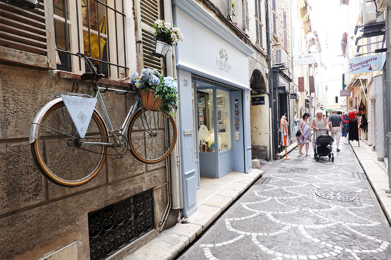 アンティーブの町の中心にあるナショナル広場(Place Nationale)から海側に向かうと、レストランやカフェ、お土産屋さんなどが立ち並ぶエリアがあります。地面が魚のうろこのようなデザインになっている小道もあって、ちょっと散歩するだけでも楽しくなる雰囲気の場所。この界隈にあるレストランやビストロでは、港町アンティーブならではの新鮮な魚介類が美味しくいただけます。
