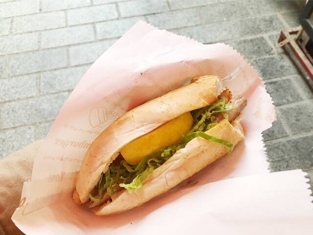 注文すると、店先にあるグリルで香ばしい匂いを漂わせながらサバを焼いてくれます。業務用の冷蔵庫で管理されているサバなので、衛生面も安心。待つこと数分、片手で持つのがやっとのボリューム満点のサバサンドが出来上がります!