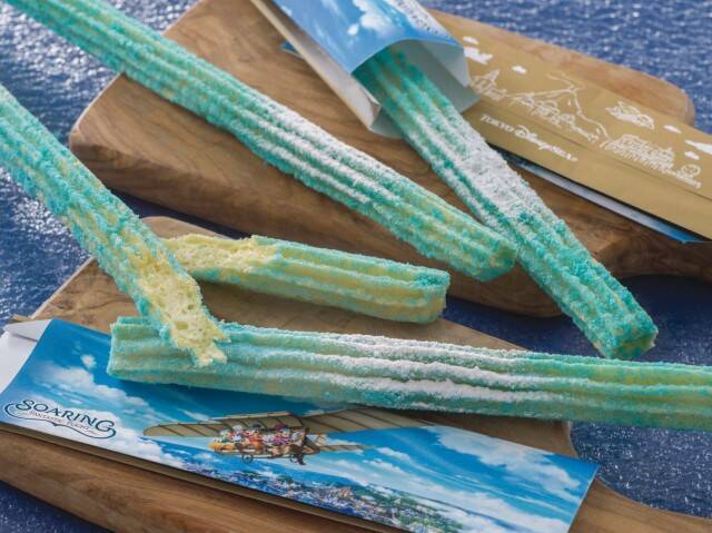 澄み渡る空と浮かぶ雲をイメージした「ファンタスティック・フライト・チュロス/1本400円」。空色のグラデーションが清涼感たっぷりです。フレーバーは甘酸っぱいパイナップル味。程よい酸味が見事なアクセントに!(ザンビーニ・ブラザーズ・リストランテにて提供)