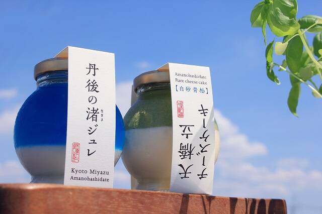 道の駅「海の京都 宮津」内の農産物等直売所「宮津まごころ市」と飲食店舗「HAMAKAZE Cafe」にて、天橋立の風景を表現したスイーツが新発売!爽やかなブルーのジュレが美しい「丹後の渚ジュレ」と、厳選された抹茶のムースをのせた「天橋立チーズケーキ」の2種類!