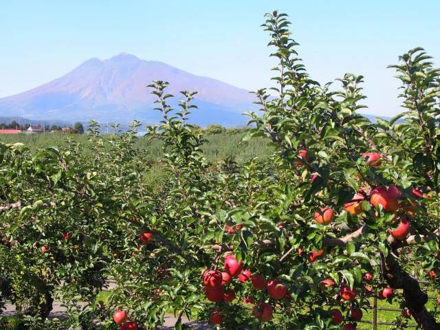 弘前からつがる市に向かって北上する間ずっと左手に岩木山が見えます。標高1625mの岩木山は津軽富士とも呼ばれ、津軽平野のどこからも見ることができます。そしてもうひとつ、この季節は津軽平野のここかしこで赤くなりかけたリンゴを見ることができます。青森県はリンゴのシェアが全国1位なのです。