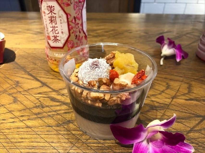 スパイシーな料理のあとには、甘いデザートも欠かせません。「有機豆乳とココナッツの黒胡麻豆花」(399円・税抜)は、有機豆乳ときび糖のベースの上に、黒練り胡麻と餡子が2層になっていて、さらに自家製のココナッツわらび餅やくるみ、さつまいも、クコの実が贅沢にトッピングされています。