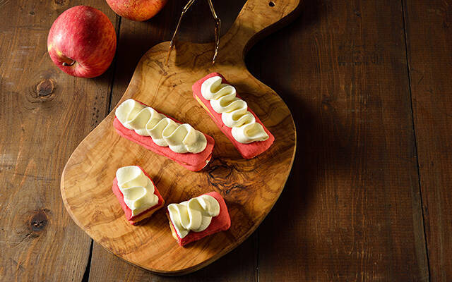 有名洋菓子店が軒を連ねる神戸に本店を置く洋菓子店「BISPOCKE-ビスポッケ-」から、季節の限定商品が発売になりました。「奏(おと)のエクレア りんご」は、マカロン風のビスケット生地でリンゴピューレをプラスしたカスタードクリームをサンドし、砂糖を加えないミルク風味の生クリームをトッピングした同店オリジナルのエクレアです。国産紅玉りんごの風味豊かな味に仕上がっているようですよ。