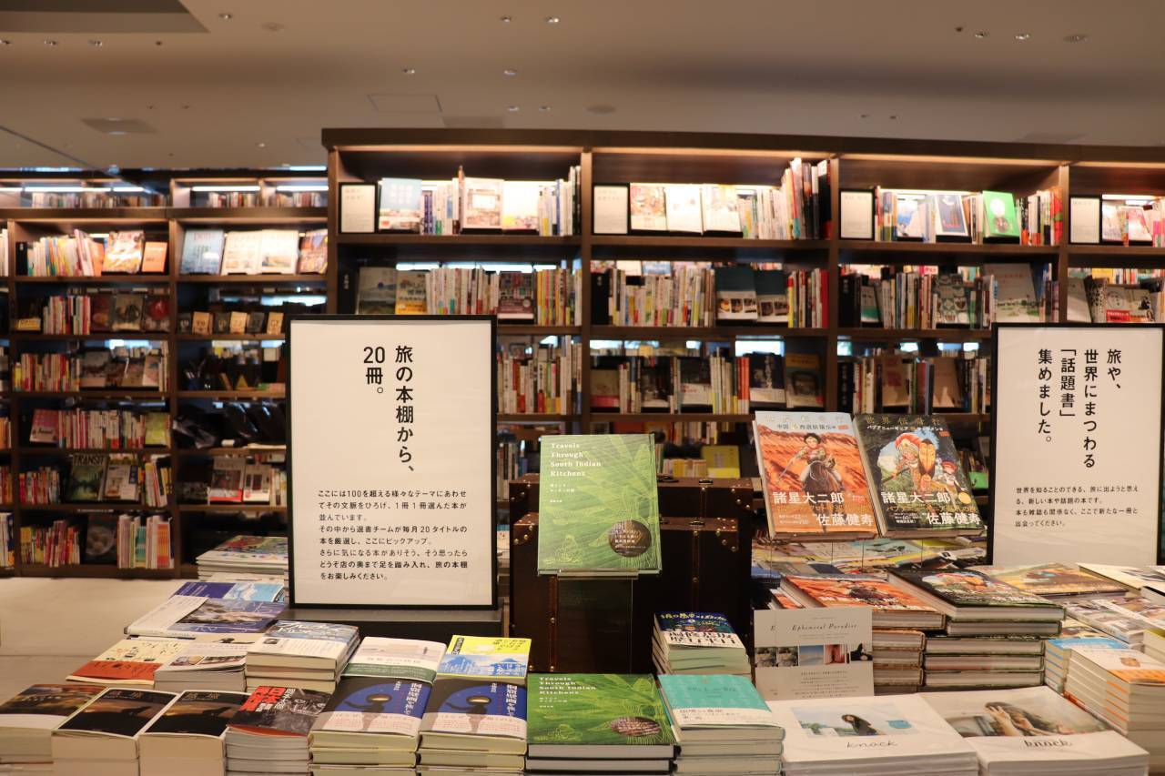 その手前に広がるのが、「旅」を切り口におよそ2万冊もの書籍や雑誌、雑貨を集めた「BOOK STORE」。平積みの雑誌エリアには通常の書店と同じように新刊が並んでいるものの、そのすぐ隣には「旅や、世界にまつわる『話題書』集めました。」「旅の本棚から20冊」といったコーナーが展開されており、いわゆる新聞の書評欄で紹介される一般的な新刊本は見当たりません。