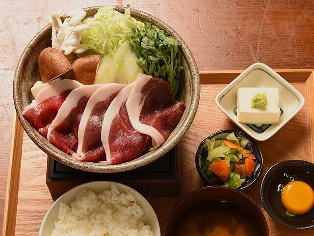猪肉をたっぷりの野菜と一緒に、すきやき風にいただきます。猪肉の甘みと柔らかさは、ここでしか食べられない絶品です。