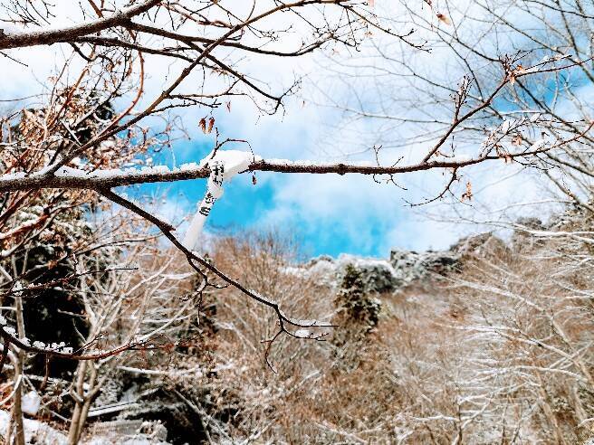 今回目指すは戸隠神社の「奥社」。訪れたのは11月の終わり。バスを降りたら雪で真っ白!奥社への参道の鳥居を前に、戸隠山がそびえ立ち、気持ちが引き締まります。約2㎞の参道を歩く前に、こちらでお手洗いを済ませておきましょう。
