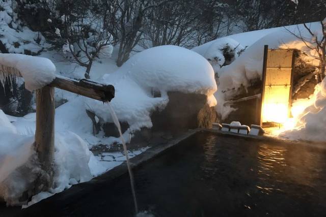 そして上の写真は雪見の湯。最初にお湯が流れてくるので、少し熱めかもしれません。とはいっても41、2度。この時はあまり雪がありませんでしたが、雪が積もると下の写真のようにさらに風情がありますね。