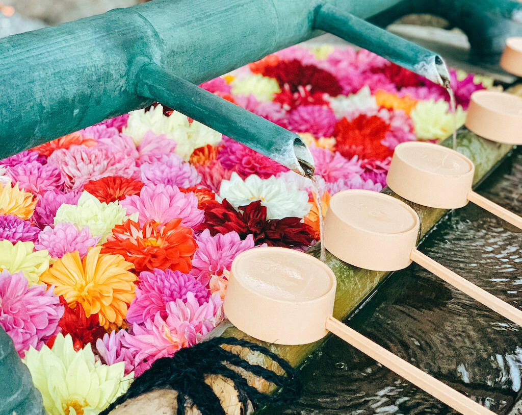 見頃を迎えるGW中は例年多くの観光客で賑わうそうですが、筆者が訪れたのは12月初旬でも写真のように満開の花が手水舎を埋め尽くしていました。季節によって浮かべられる花の種類が異なるので、何度も訪れてみたくなりますね!