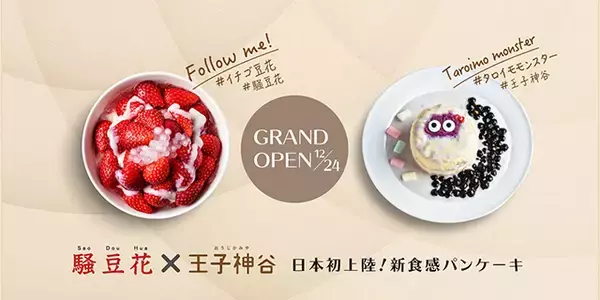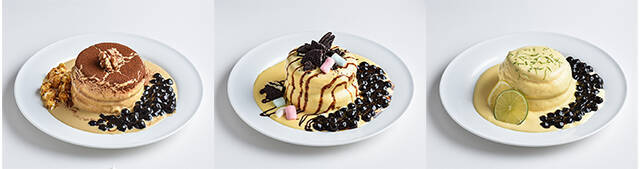 今回のコラボレーションで、「騒豆花ルミネ池袋店」で「王子神谷」のパンケーキが提供されています。パンケーキに、ミルクティーやチョコレート、レモンクリームなどいろいろなソースをかけタピオカをトッピングした、色とりどりのメニューがそろいます。パンケーキの上にキュートな顔がデザインされた、抹茶やタロイモ、チョコレートソースの「モンスター」バージョンも、SNS映え間違いなしの可愛い仕上がりに。
