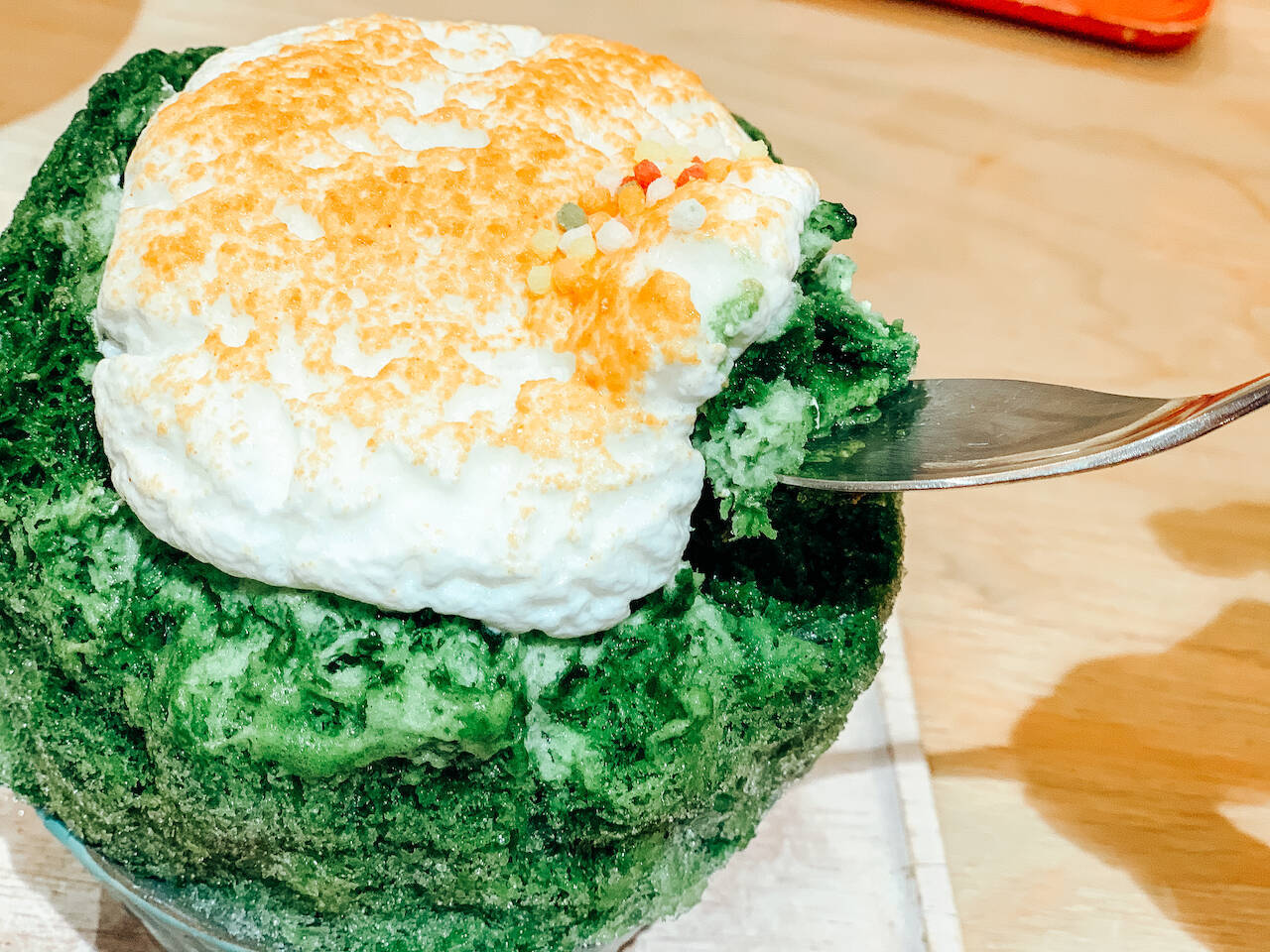 かき氷というと頭がキーンとするイメージですが、かき氷の上にたっぷりと乗った「ミルクエスプレーマー」と呼ばれるムース状の泡が甘いシロップと一緒に絡みあって、口に入れた瞬間すっと溶けるのでキーンとならない!