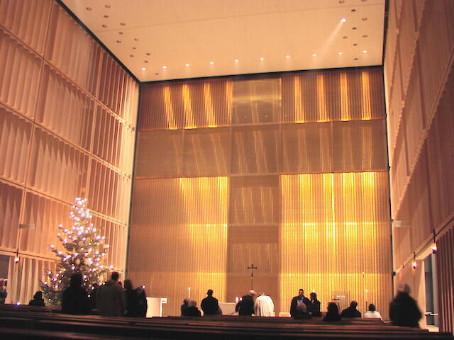 内部にはガラス壁を通して、燦々と光が降り注ぎます。内壁のルーバーの間隔が後方から前方に向かって広がっていくと、空間に光のグラデーションが現れ、視線は祭壇のある前方へ引きつけられます。