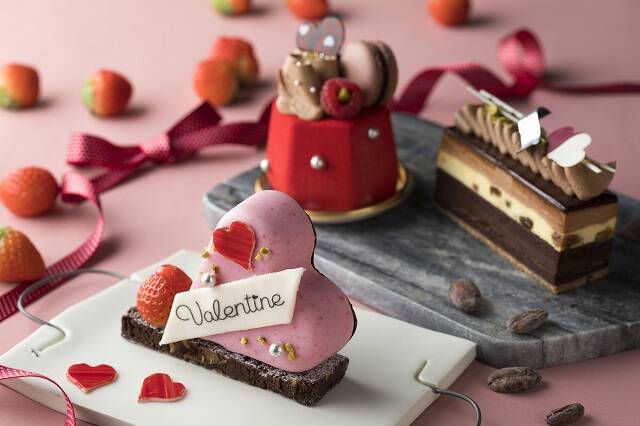 フランボワーズの甘酸っぱさが“恋の味”を思わせるキュートなスイーツ。6角柱のフランボワーズムースの下には、チョコレートのサブレと生地を重ね、ミルクチョコレートのムースとビターチョコレートブリュレを層にして閉じ込めました。ハート形のチョコやマカロン、ミルクチョコレートのクリームなどをトッピング!