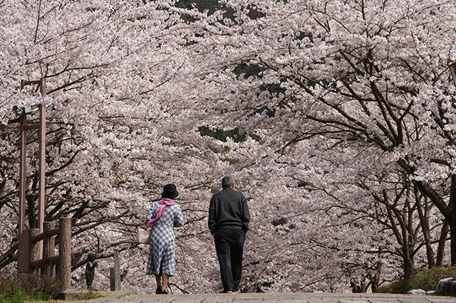 京都の奥座敷、亀岡市を流れる七谷川沿いにある「和らぎの道」は、30品種1,500本の桜が約1キロメートルにわたって並木となっています。丹波地方の数ある桜の名所の中でも特に人気の桜スポット。シーズンを迎えると、和らぎの道沿いをのんびりと散歩しながら花見をする人たちの姿が多くみられるそうですよ。