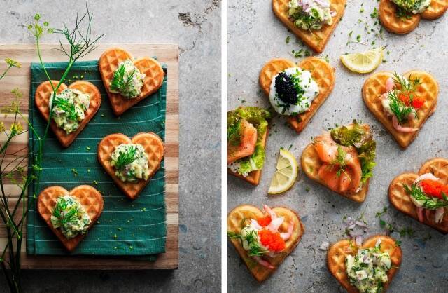 甘さ控えめのハート形のワッフルがサーモン、ニシン、エビの3種のタルタルにマッチするプレートです。