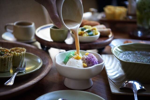 ココナッツミルクの氷をふわっと削った上にパンダンリーフのお餅、小豆がのっています。その初めて見るビジュアルに一瞬躊躇しますが、かき氷の上から黒蜜をかけて食べると口の中でやさしくほどけて止められないおいしさ。パンダンリーフのお餅の香りもいいアクセント。甘すぎず、ちょっと食べすぎたな、というときでもさっぱり食べられてしまうスイーツです。