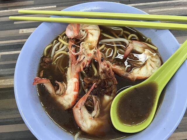 海老の出汁の風味を余すところなくいただける蝦麺。真っ黒なスープに驚くも、見た目に反してさっぱりした味わいで、最後まで飲み干せるほど。白と黄色の卵麺によく絡みます。トッピングのフライドオニオンも香ばしく、これにチリソースを加えると、さらに深い味わいに。たっぷり入った主役の海老は大きさで値段が変わります。