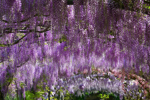 バルディーニ庭園の斜面の一角には、毎年4~5月に美しい藤の花が棚一面に咲き誇り、見事な藤の花のトンネルを作り出します。