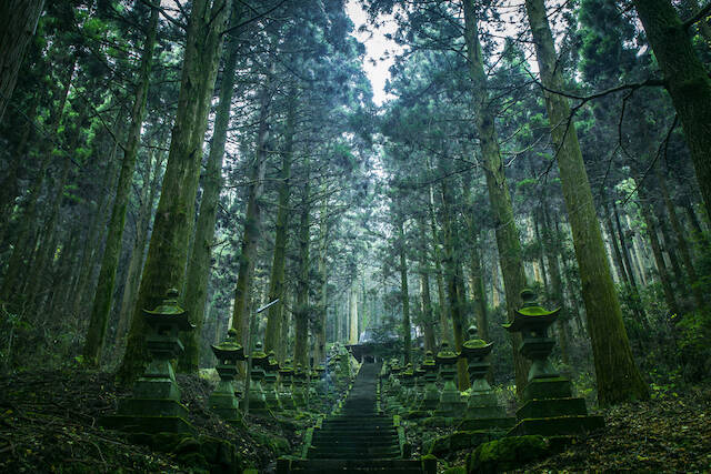 参道沿いに並ぶ印象的な石灯籠は、ご神徳を授かった地元企業家より奉納されたものだそうです。荘厳な雰囲気と、熊本県出身の漫画家・緑川ゆき原作のアニメ映画「蛍火の杜へ」の舞台になったことで人気が高まりました。神域と感じとれる、静謐な雰囲気に浸ってみたいものです。