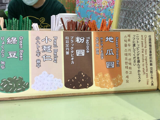 豆花のトッピングは、お好みで2種類選ぶことができます。ここのトッピングの注文の仕方は少し変わっていて、トッピング名が書かれた色付きスティックをお店の方に渡す形となります。日本語の説明も書かれているので、言葉がわからなくても安心です。