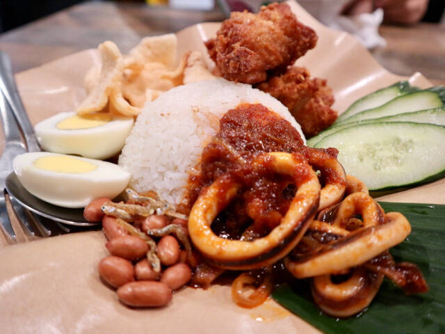 筆者が注文したのは、マレーシア料理の定番、ココナッツミルクで炊いたご飯におかずを添えた「ナシレマ」と、鶏のから揚げのセット「池先生椰漿飯炸雞配參芭透抽」です。